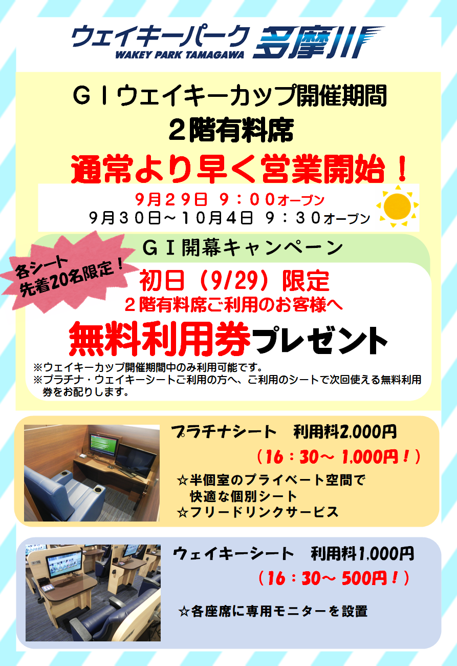 GⅠウェイキーカップ開催期間(9/29~10/4)、外向発売所2階有料席の営業開始時間が早まります。