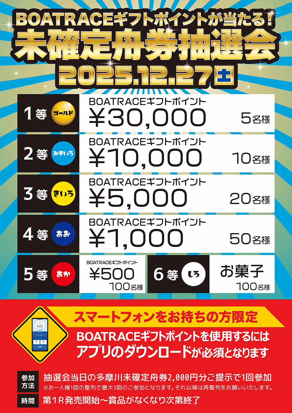 備 考 多摩川の未確定舟券2,000円分につき1回抽選。